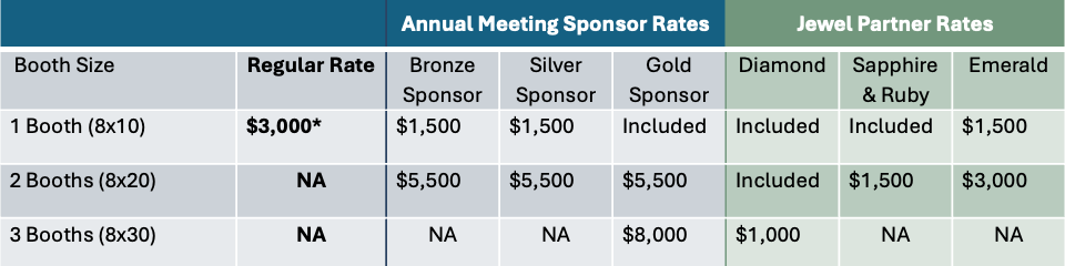 *Booth does not include electricity, AV, furniture upgrades, or additional items. Information to order these items for your booth will be provided by show management in January of 2026. Exhibit Hall Hours for AttendeesApril 21, 2026, 3:30 pm - 5:00 pm Exhibit Hall Opening and Welcome Reception We have extended Exhibit Hall hours on Wednesday and have increased the breaks to 30 minutes while the hall is open. Exhibit Hall Floor PlanExhibit Hall Floor Plan, view current exhibitors and see what booths are still available. Exhibitor Rules and Guidelines (.pdf) Download the 2026 Convention & Expo Prospectus!Purchase your Exhibit Space here!If you would like more information about becoming a Jewel Partner, including associated benefits, please contact: [email protected]. |